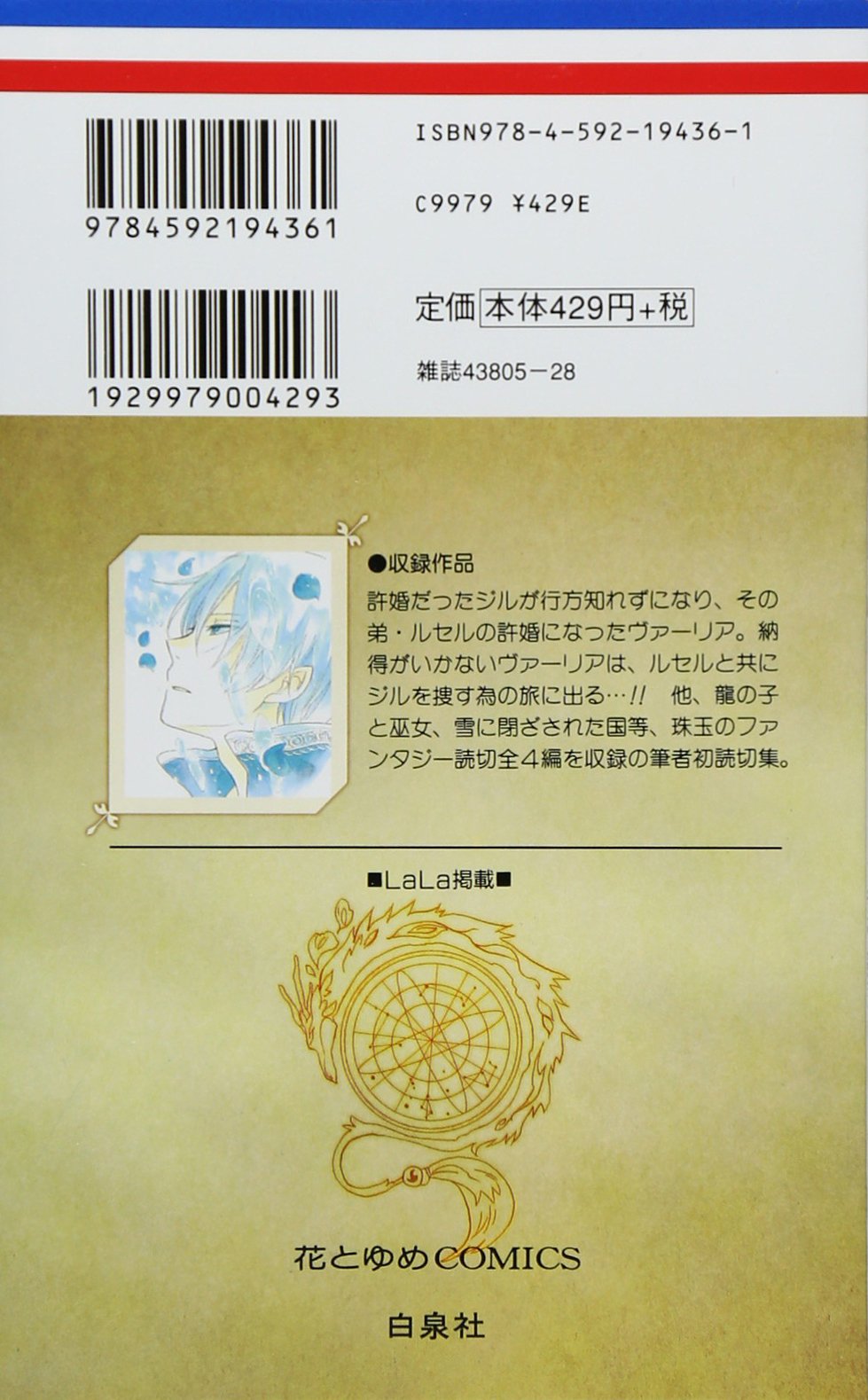 A collection of short stories: 1) Vahlia no Hanamuko: Jiru and Vahlia were engaged. But Jiru suddenly went missing! Four years later, Vahlia was betrothed to his younger brother. During the night of the celebration of her second engagement, Vahlia decides to go on a journey… in search of Jiru! 2) Ryuu no Moriuta : The dragon child Kito and the priestess Shuen await the day Kito becomes the Heavenly Dragon. 3) Ginsekai no Shoumei : Alza lives alone on a desolate snowy plain. One day, Leah, a sorcerer from the magical city collapses near his house. Alza forbids Leah from using magic in his presence and shows her how beautiful life can be outside of the magical world. But, why does Alza hate magic, how did Leah get outside the magical city, and what will happen when Leah returns home? 4) Otogibanashi no Fude : At a far away village, there’s a sacred tree where the Water God dwells. It’s Sasara Yuukei’s task to trace the fading letters of the contract between the Water God and the people of the village. One day, while carrying out his task, he suddenly met the Water God herself! And gradually, he found out that what he’s been doing every day is actually... ================= Jiru và Vahlia được 2 bên gia đình hứa hôn. Nhưng Jiru đột nhiên mất tích. 4 năm sau đó, hôn ước được chuyển sang người em trai Lucel. Vahlia quyết tâm đi tìm Jiru làm sáng tỏ mọi chuyện cùng Lucel. Vahlia sẽ quyết định thế nào khi nhận ra tình cảm của cô dành cho Lucel. |